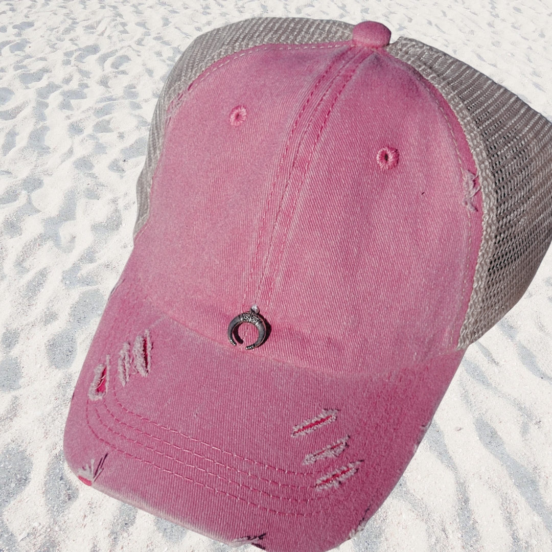 Gorra rosa desgastada con aplicación en el frente plateada.